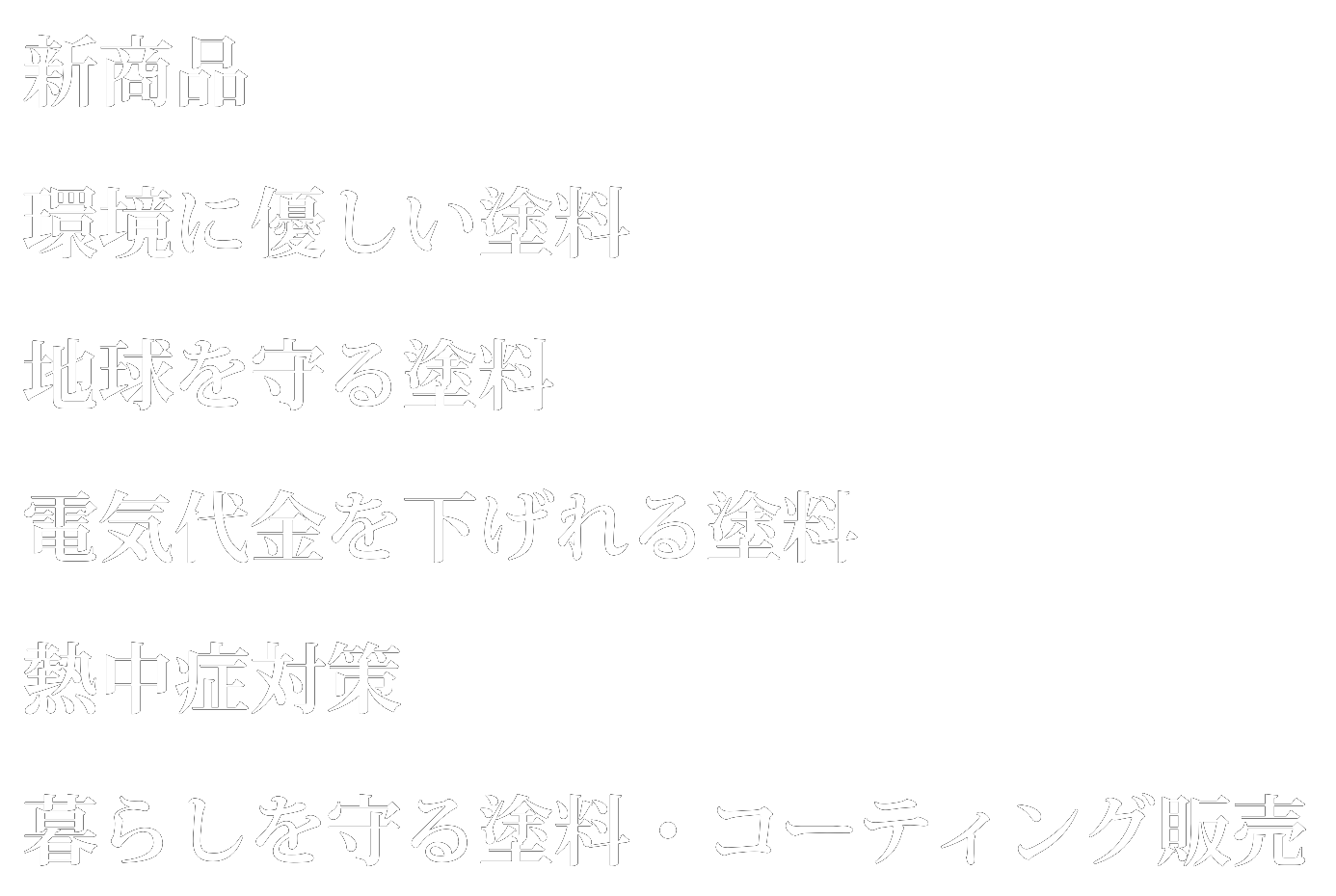外壁塗装や抗菌コーティング、研磨剤、災害常備品など、多彩な製品を通じて、建物の衛星、美観を守り、快適で安心できる生活環境を支えます。私たちは、‘‘暮らしの衛星と美しさを守るパートナー’’として、社会に信頼と安心をお届けします。